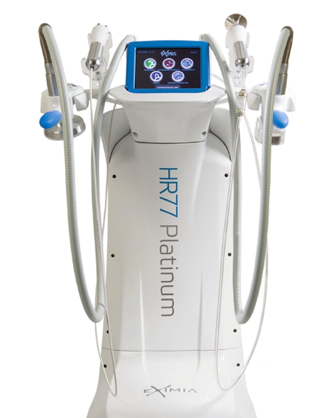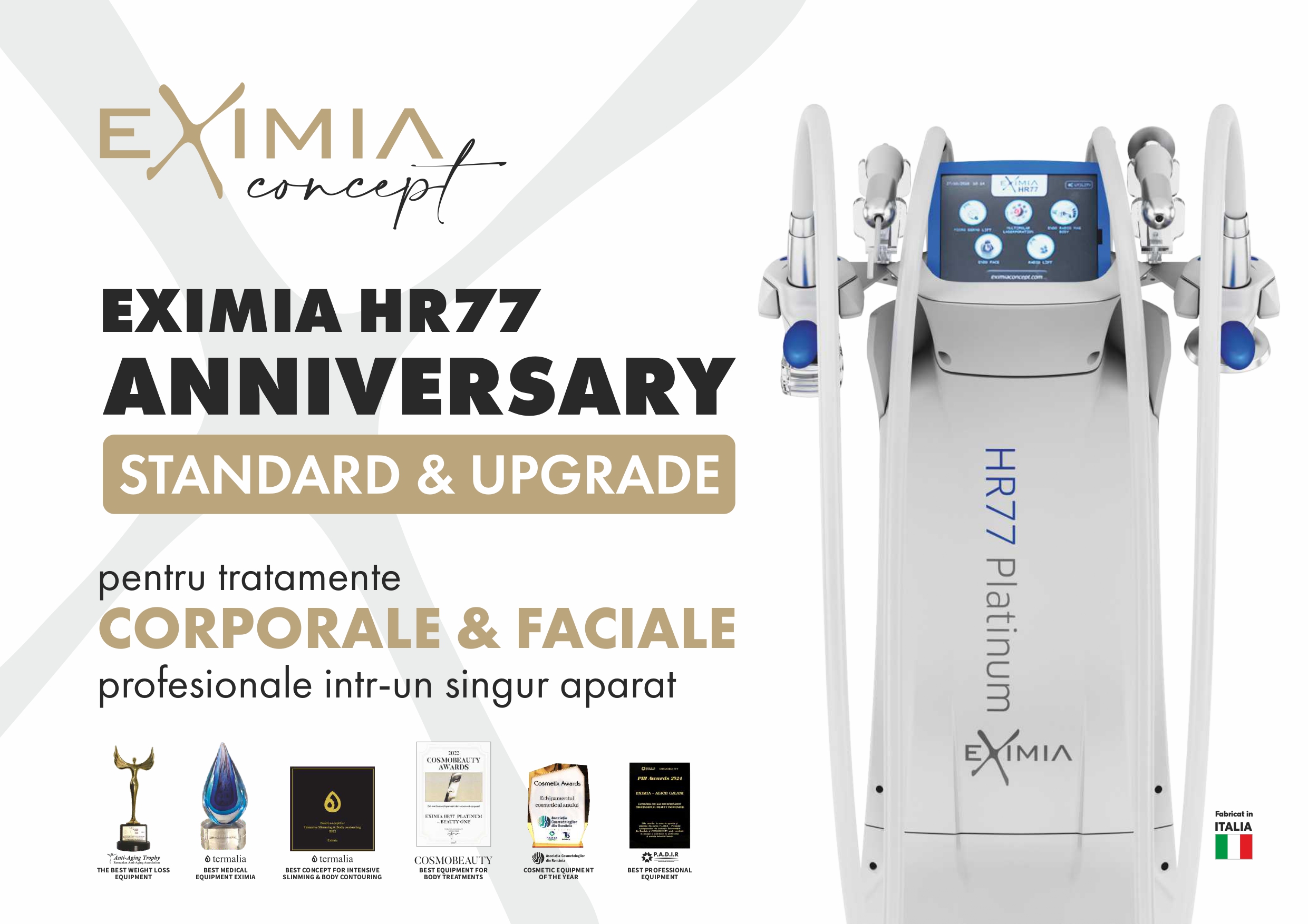EXIMIA HR77 Platinum Anniversary este cea mai complexă platformă non-invazivă pentru remodelare corporală, drenaj limfatic, tonifiere și rejuvenare facială.