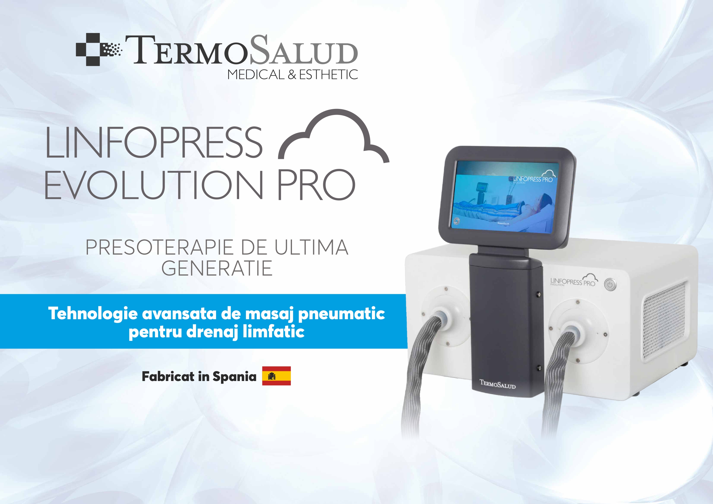 Cu o experiență de peste 30 de ani în dezvoltarea tehnologiilor pentru drenaj limfatic, Termosalud oferă prin Linfopress Evolution PRO o soluție completă și sigură, potrivită atât pentru centre estetice, cât și pentru clinici medicale.