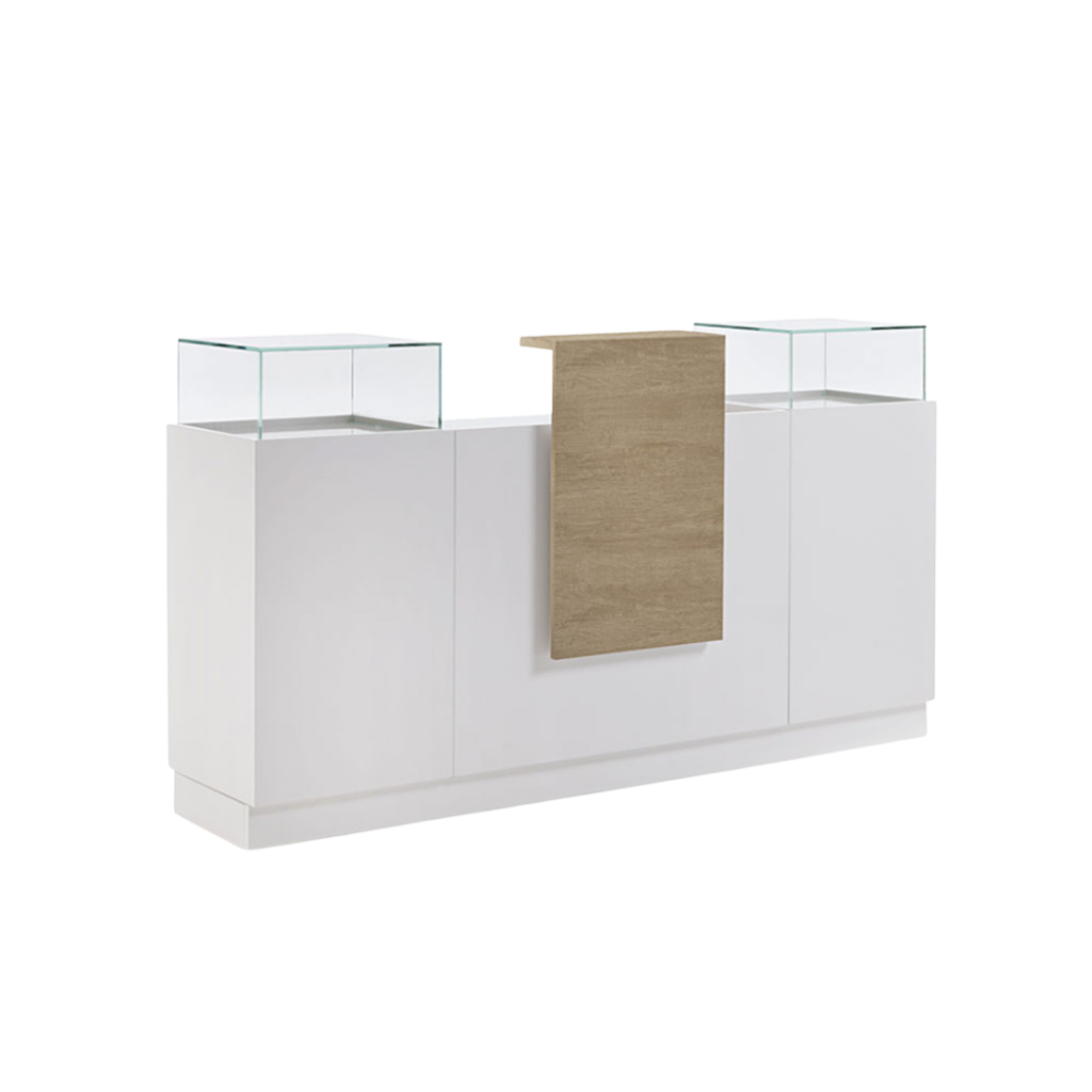 Reception Light Desk tris este cea mai amplă configurație, cu birou Light Desk și trei vitrine Light pentru expunerea produselor.