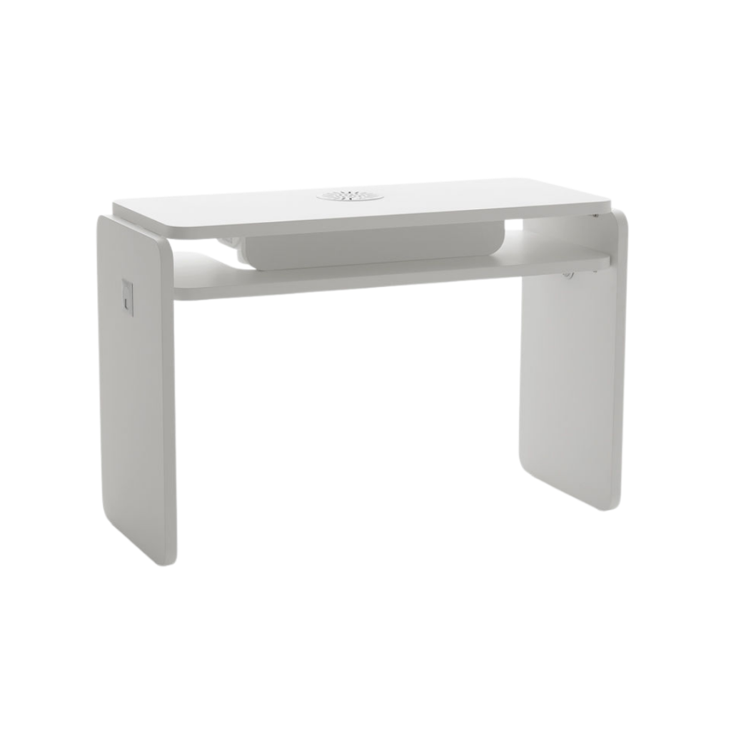 Tavolo Nail Nat este o masă de manichiură cu structură din lemn nobilitat alb opac, concepută pentru posturi profesionale. Blatul poate fi cu sau fără orificiu pentru aspirator și include o mensolă dedicată pentru lampă UV.